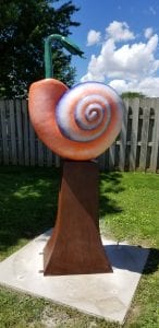 Near the Genesius Stage in Lincoln Park, picnickers will discover “Reaching to the Moon” by Tim Frye, of Shumway, IL. Frye explains, “As humans, our never-ending dreams consist of growing and always reaching upward. It is interesting that nature too moves in this way. This sculpture was designed to have kinetic motion. The upper section sways gently in the wind.”