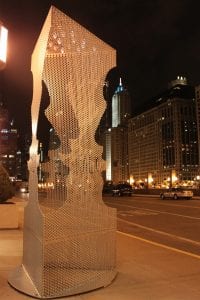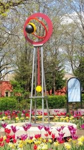 Just outside Longview Park at the intersection known as “Five Points” will be “Moon shadow” by Peter N. Gray of Chicago. “Moon Shadow was inspired by last year’s full eclipse of the moon and the orbits of the moon and earth. The moon pendulum (fixed on the sculpture) refers to the phases of the moon.” (Expected soon, this sculpture was delayed due to rioting and street closures in Chicago.)