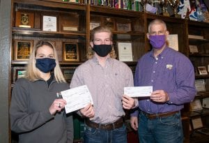 Alpha Gamma Rho President Cameron Kessling, center, presents the proceeds of the recent Smokin’ Hog event to Agriculture Instructor Jana Knupp and School of Agriculture Director Andy Baker.