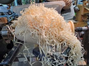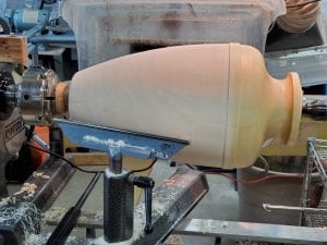The hollowing part takes longer, to remove parts of the wood, with a boring bar with a cutter on the end. Sinner uses a laser mounted to the bar, to determine the wall thickness, to make sure it’s consistent.