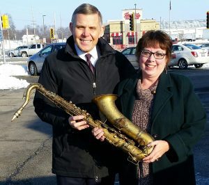 Tom Harris and Liz Beiderbecke-Hart with the 1923 Don Murray saxophone.