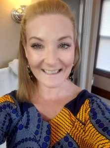 Laura Fontaine is director of World Relief Quad Cities, which helps resettle refugees here from around the world. She’s wearing a dress from Rwanda.