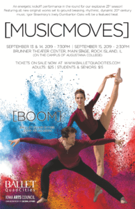 Ballet Quad Cities dances back in with their latest season opener, MUSICMOVES, doing a grand jete into the Brunner Theater Center on Augustana Campus in Rock Island at 7:30 p.m. Sept. 13-14 and 2:30 p.m. Sept. 15.Don’t miss this all new performance – new dancers, new venue, and new music! Limited number of tickets available for this intimate performance at the Brunner Theatre Center on the campus of Augustana College. Get your tickets online today or call Amanda at 309-786-3779 for more information.