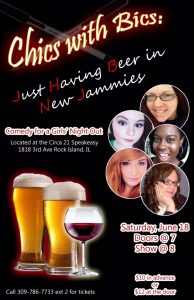 Heather Nobiling is hoping to recreate that loose, hilarious feel in the new show she’s put together, Chics with Bics, Just Having Beer In New Jammies: Comedy For a Girls’ Night Out. The gig takes place this Saturday, at the Speakeasy in Rock Island. Doors open at 7, show starts at 8. The cost is $10 in advance, $12 at the door. All female comics are onstage, but boys are allowed (and even encouraged!) to join in the fun.