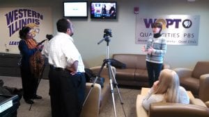 Erika and Tar Macias, left, filming Lora Adams at WQPT in Moline.