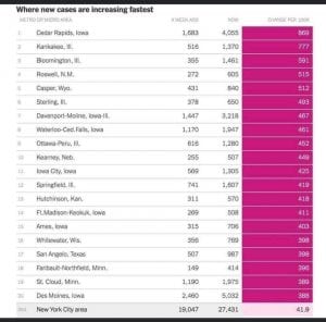 The New York Times released this graphic today with CDC numbers showing that Iowa is a growing hot spot for covid, and the Quad-Cities is right outside the top 10 worst spots in the country for the spread.