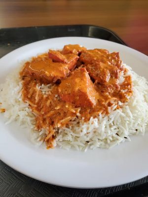 While I want to get dangerous and eat outside the normal limits of what I would call comfort food, I play it safe with an order of Butter Chicken. Butter chicken or Murgh Makhani is a curry of chicken in a spiced tomato, butter and cream sauce. Served on Balsamati Rice, it’s a savory almost sweet kind of dish. This is a perfect dish for hangovers or those recovery days.