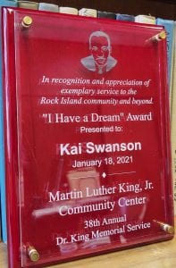 The King Center award given to Kai Swanson is in “recognition and appreciation of exemplary service to the Rock Island community and beyond.”