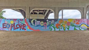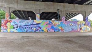 Public Mural (Lead Artist Sarah Robb), with Senior Apprentice Liam Haskill, sponsored by Moline Centre. This mural is located along the bike path in Moline, under the Arsenal bridge, between the Channel Cat and Kone Centre. This area was in need of a new mural and Moline Centre/Geoff Manis asked Quad City Arts to make that happen.