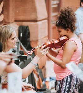 Carolyn Van De Velde helps a girl try a violin at the June 8 “Paint the Town” event at River Music Experience, Davenport.