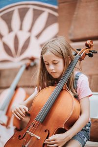 A young girl tries out a cello from the Quad City Symphony at the June 8 “Paint the Town” event at River Music Experience, Davenport.