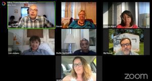 Eric Teeter (upper left) hosting a recent Zoom episode of Talking Theatre.
