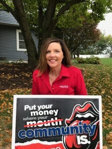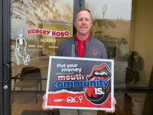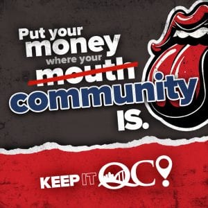 The initiative includes social media, posters, flyers and yard signs with a mouth logo (similar to the iconic Rolling Stones logo) and the tag line. “Put your money where your community is,” with the word “mouth” crossed out. Many signs were put up across the region Thursday.