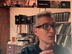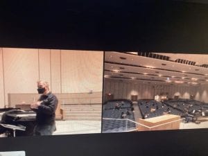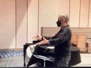 He works from his campus office, plays bits on the piano, and he conducts along with the recording. Members can put questions in the Zoom chat. Hurty gives them an assignment for the next week and suggests YouTube videos that play specific parts louder than others along with the chorus.