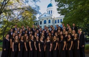 The Augustana Choir, in pre-pandemic days, in front of Old Main on the Rock Island campus.