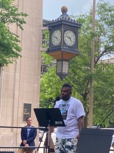 Altese Ramsey recited his poetry at Tuesday’s event in downtown Davenport.