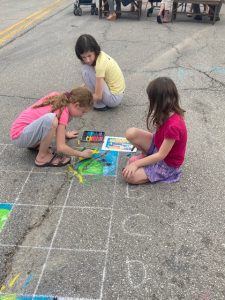 Kids working on chalk art provided by Quad City Arts on a closed-off Main Street.