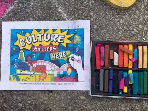Chalk art for a “Culture Matters Here” mural, the slogan of QCCT.
