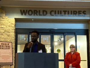 Abe Mbanzamihigo, preferred communities caseworker for World Relief, spoke at the May 21 opening celebration at the Putnam, as president/CEO Rachael Mullins looked on.