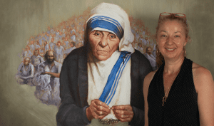 The artist Cecile Houel with her portrait of Mother Teresa.