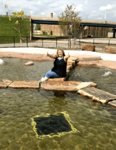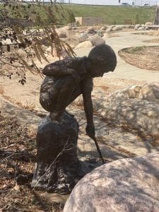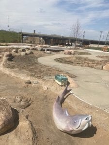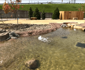 The first phase is described online this way: “This whimsical garden is a playful interpretation of the Mississippi River. Surrounded by greenery, flowering perennials and native prairie plants, the intrigue of water play allows children to be carried away by their imaginations in