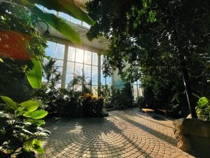 Its stunning centerpiece is the 70-foot-tall atrium of the Sun Garden — a 6,444-square-foot climate-controlled space that includes a 14-foot waterfall, stream, and fish pond that circulate water through the atrium, providing a home for the popular Japanese Koi, and supplying vital humidity for plants. The Sun Garden is home to fruit-bearing plants including coconut, banana, vanilla, coffee and the cocoa tree (chocolate).