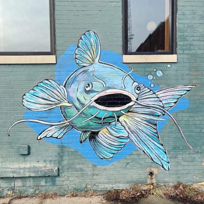 She said that Cole originally thought of having a local graffiti artist cover the unwanted graffiti with spray paint. “Then I thought about it, and I was like, it’s a blue cat. I could do a really cool catfish,” Dawn said. “I was like, well, I don’t do spray paint, but I’d love to paint a really cool catfish and he’s like, all right then.”