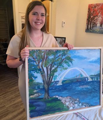 Less than three months after giving birth to her first child (daughter Violet), Dawn did a live painting of a QC river scene Oct. 28, 2021, in the Figge Art Museum lobby for the launch of the new “QC, That’s Where” brand campaign and partnership between Visit Quad Cities and the Chamber of Commerce.