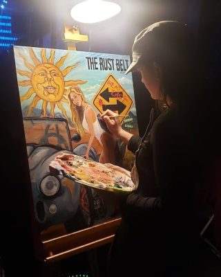 Dawn did a permanent mural above the Rust Belt bar, a Stevie Nicks one in the women’s restroom, and an electric butterfly mural, done in winter 2019.