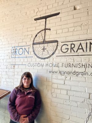 Dawn standing outside her Iron & Grain logo painting at the Rust Belt complex in East Moline.
