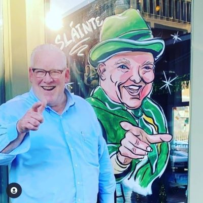 Me & Billy co-owner Bill Collins with one of Dawn’s window paintings at his downtown Davenport restaurant.