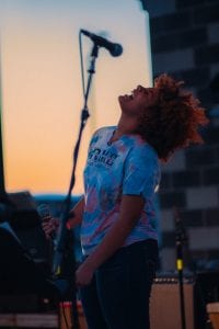 Boyer singing at the August 2019 Sweatstock, at Murphy Park in East Moline.