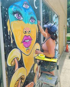 Dawn working on a mural for Yabba Dabbas glass shop in Rock Island.
