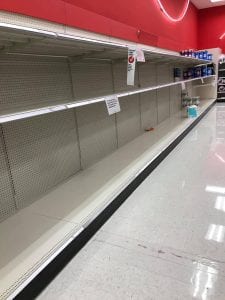 Iowa side stores seem to be in more of a frenzy, given Governor Kim Reynolds’ proclamations and immediate restrictions put in place yesterday. The Iowa-side Target and Sam’s Club shelves are pretty much entirely devoid of toilet paper and are becoming short on paper towels and other products, as of yesterday evening.