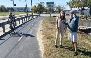 WIU RPTA Professor Rob Porter (right) and WIU senior Sadie Parker talk on a video phone call to WIU alumna Haily Hinson next to the bicycle trails in front of WIU’s Quad Cities campus.