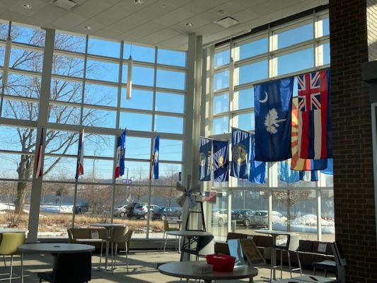 The airy, light-filled lobby in Western Illinois University’s Building C in Moline, where WQPT is based.