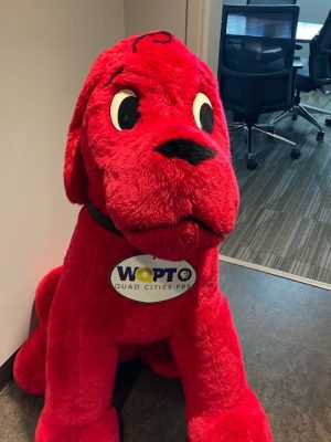 Clifford the Big Red Dog stands sentry at WQPT offices.