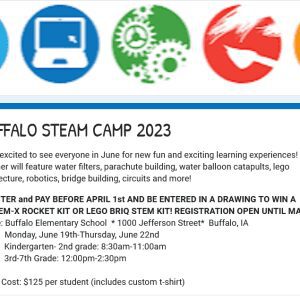 Buffalo Elementary will be hosting their annual STEAM Camp this summer! Registration is open today to the public for students that will be going into K–7 next year! (Primarily geared towards grades K–6 for 2023–2024 school year). With a registration cap of 60 students (30 K–2 and 30 3–6), they are already close to filling […]