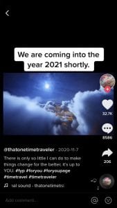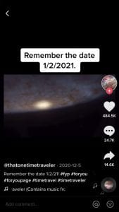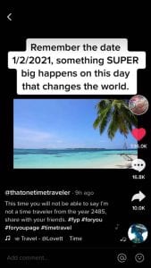 The time traveler, who also claims to be human and from the planet Vadho (you know, where Cardi B and Megan Thee Stallion built that house), has been posting on TikTok for several months, and one of the things they’ve posted repeatedly is that something HUGE is going to happen on Jan. 2, 2021, which is a “very good and exciting day for humanity.”