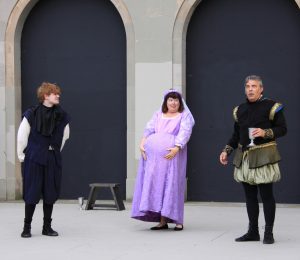 Noah Stivers (Claudio), Denise Yoder (Julietta), Mischa Hooker (Lucio) in “Measure For Measure.”
