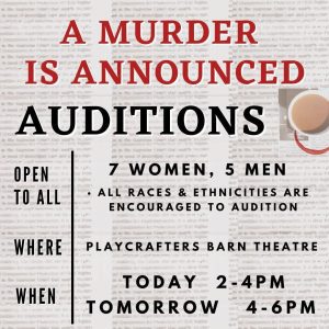 Playcrafters Barn Theatre will be holding auditions today from 2-4 PM and tomorrow from 4-6 PM for “A Murder Is Announced” by Leslie Darbon, adapted from Agatha Christie’s novel, directed by Madelyn Dorta. Actors should come prepared to cold- read from the script, all levels of experience are encouraged to try out, as well as […]