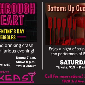 Saturday, February 12, The Speakeasy is pleased to welcome back Bottom’s Up Burlesque! Bottom’s Up is the longest running burlesque troupe in the Quad Cities and is excited to premiere their all new show BLOODY VALENTINE! Flowers and chocolates are so overrated so let the gorgeous performers of Bottoms Up Burlesque show you a darker […]