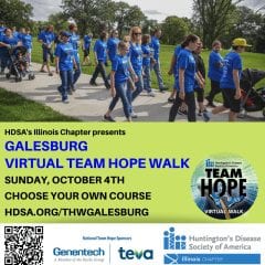 The Huntington’s Disease Society of America’s (HDSA) Illinois Chapter will be hosting the Galesburg Virtual Team Hope Walk on Sunday, October 4. Team Hope is HDSA’s largest national grassroots fundraising event. Thousands of families, friends, co-workers, neighbors and communities walk together each year to support HDSA’s fight to improve the lives of people affected by […]