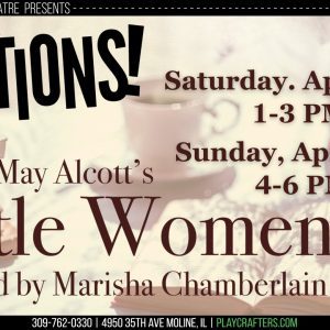 Little Women AUDITIONS By Louisa May Alcott, adapted by Marisha Chamberlain Directed by Madelyn Dorta Auditions will take place at Playcrafters Barn Theatre in Moline… -Saturday, April 29th from 1-3 PM -Sunday, April 30th from 4-6 PM Performance Dates: • Friday, July 21 – Sunday, July 23 • Friday, July 28 – Sunday, July 30 […]